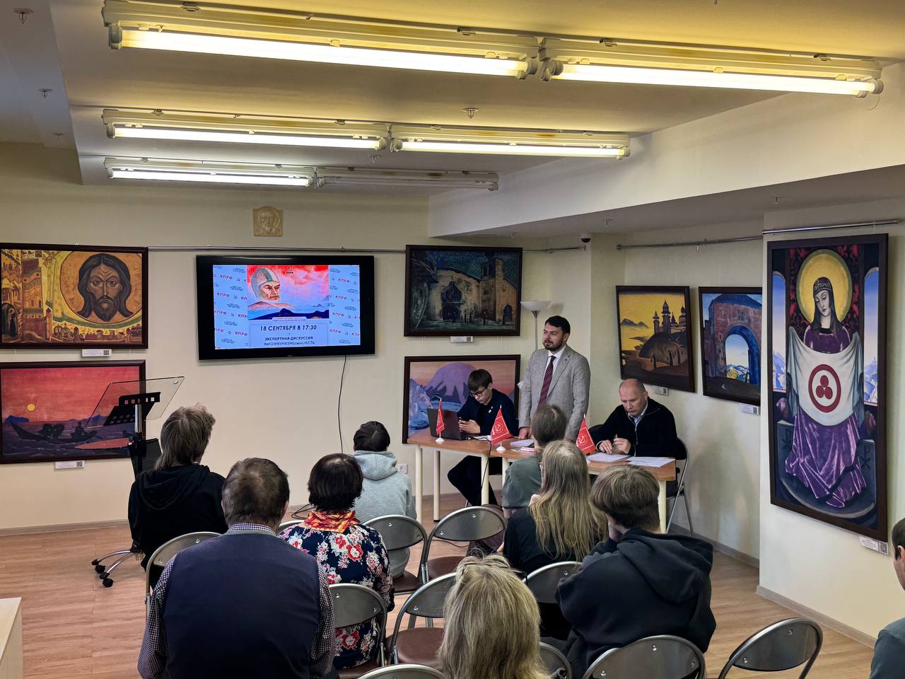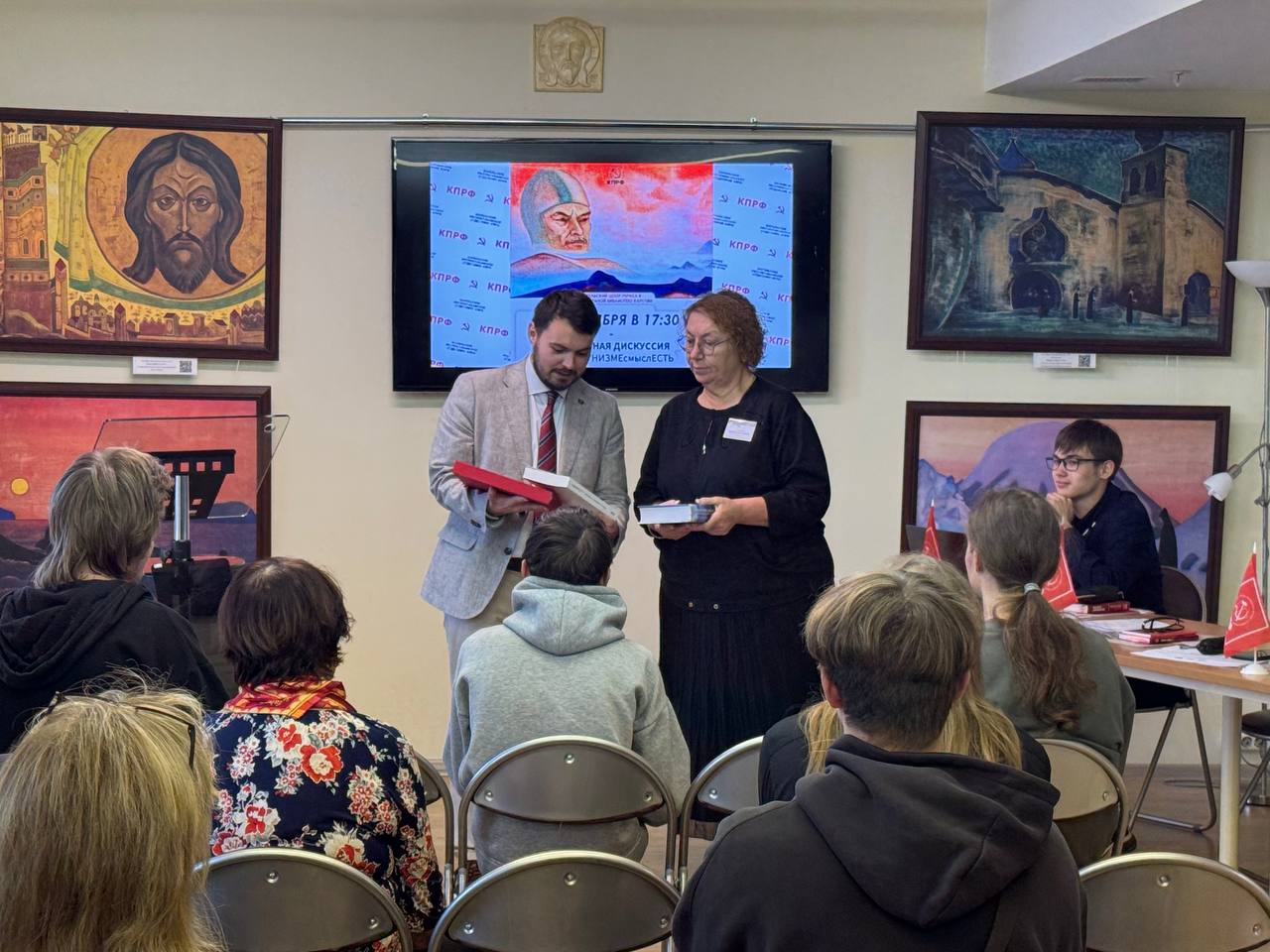 Коммунисты и комсомольцы собрались в Национальной библиотеке, в Карельском Центре Николая Рериха. Ожидается несколько интересных докладов. Никита Ковынев подарил директору библиотеки Марине Никишиной несколько книг об истории российско-китайских отношений.