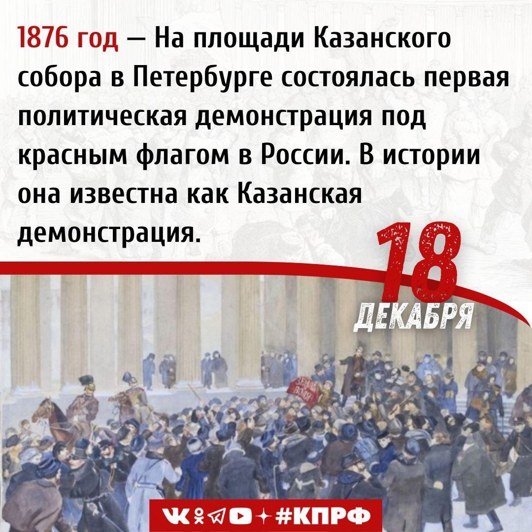 18 декабря 1876 года – на площади Казанского собора в Петербурге состоялась первая политическая демонстрация под красным флагом в России. В истории она известна как Казанская демонстрация.