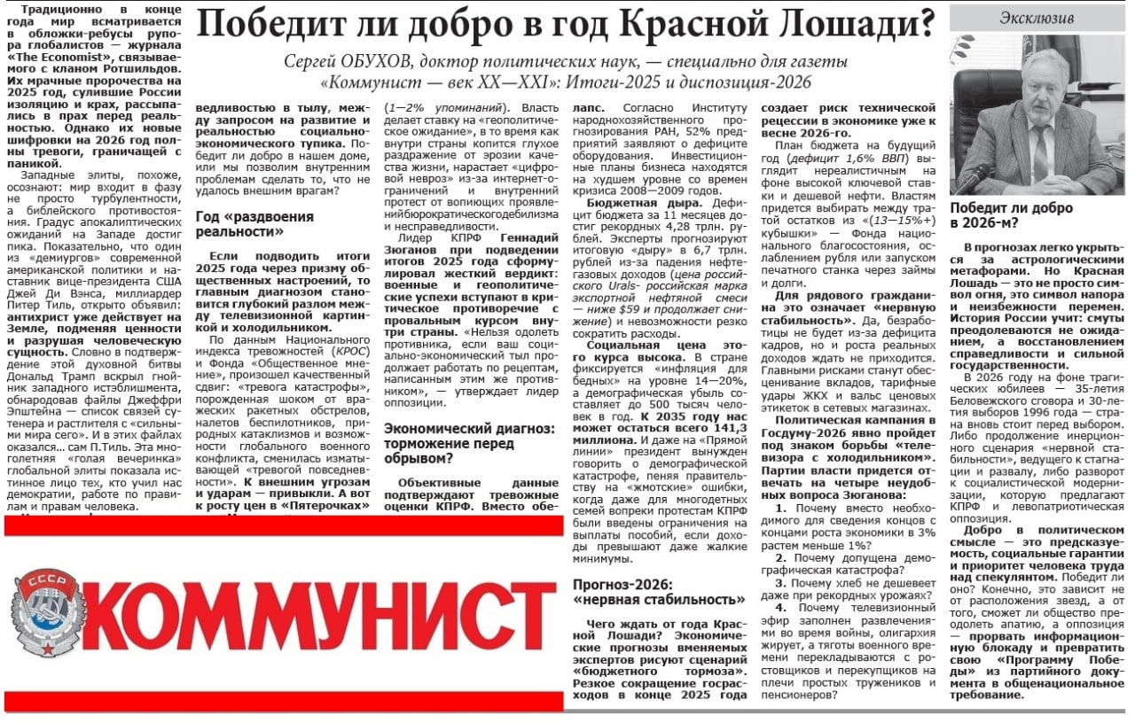 Сергей Обухов - саратовской газете «Коммунист — век XX—XXI»: Победит ли добро в год Красной Лошади? Итоги-2025 и диспозиция-2026