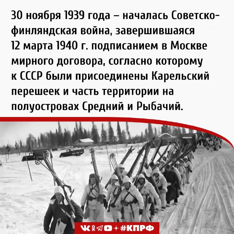 30 ноября 1939 года – началась Советско-финляндская война, завершившаяся 12 марта 1940 г. подписанием в Москве мирного договора, согласно которому к СССР были присоединены Карельский перешеек и часть территории на полуостровах Средний и Рыбачий.