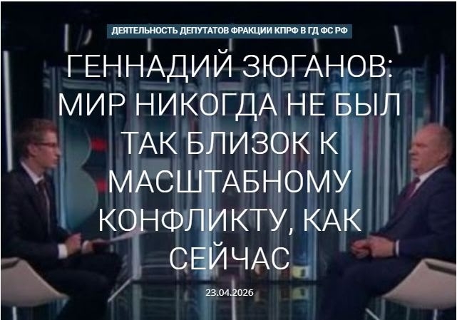 В интервью лидер КПРФ Геннадий Зюганов оценил текущую геополитическую обстановку и подчеркнул: мир еще никогда не был так близок к масштабному конфликту, как сейчас, — впервые с 1945 года, после разгрома германского фашизма и японского милитаризма.