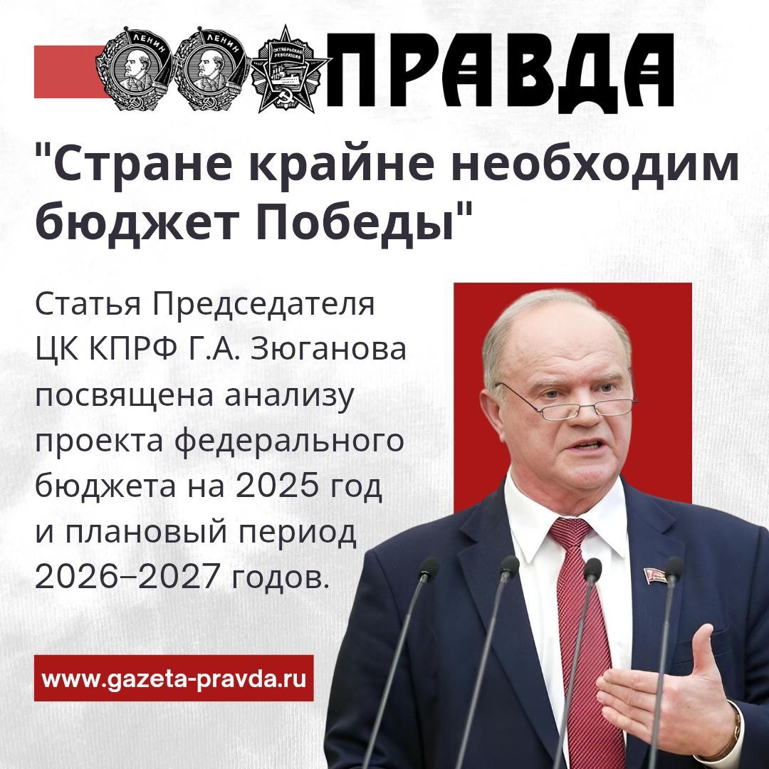 22 октября Госдума рассмотрит проект федерального бюджета на три года. В канун рассмотрения Государственной Думой главного финансового документа страны с программной статьёй в "Правде" выступил Председатель ЦК КПРФ, руководитель фракции КПРФ в Государственной думе Геннадий Зюганов .