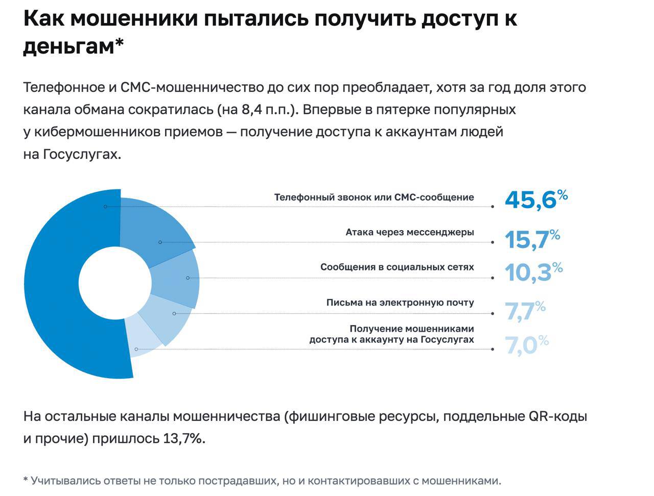- 45% мошенничеств совершается через обычные звонки и SMS;