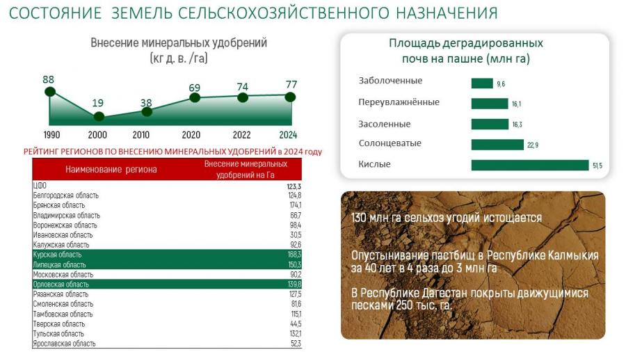 Владимир Кашин показал тревожные цифры площади деградированных почв на пашне: 51,5 млн га поражены повышенной кислотностью, 25,7 млн га - переувлажненные и заболоченные, 39 млн га - засоленные и солонцеватые.