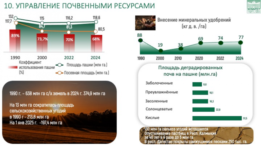 Председатель Комитета по аграрным вопросам Владимир Кашин в своем докладе четко обозначил приоритеты и проблемы, которые необходимо решать: «Проблема опустынивания и истощения почв, безусловно, имеет критическое значение. Последние 10 лет мы вплотную занимаемся вопросами плодородия почв и все 10 лет на всех парламентских и научных площадках неустанно говорим о надвигающихся проблемах.